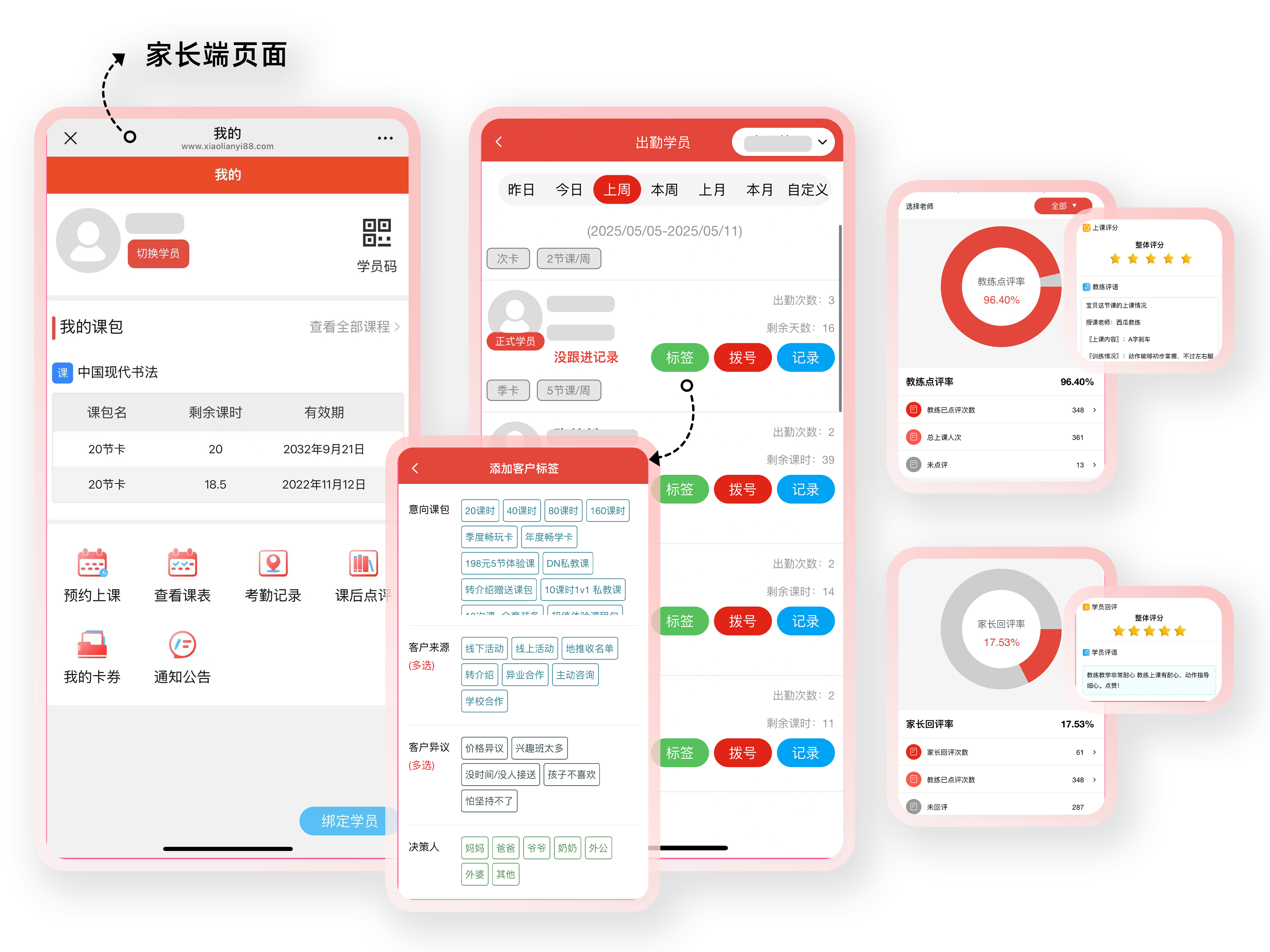 跟进追踪:排课约课表、到访率统计表、老师一对一演练过关、客户跟进表、分析盘点表、业绩分析表