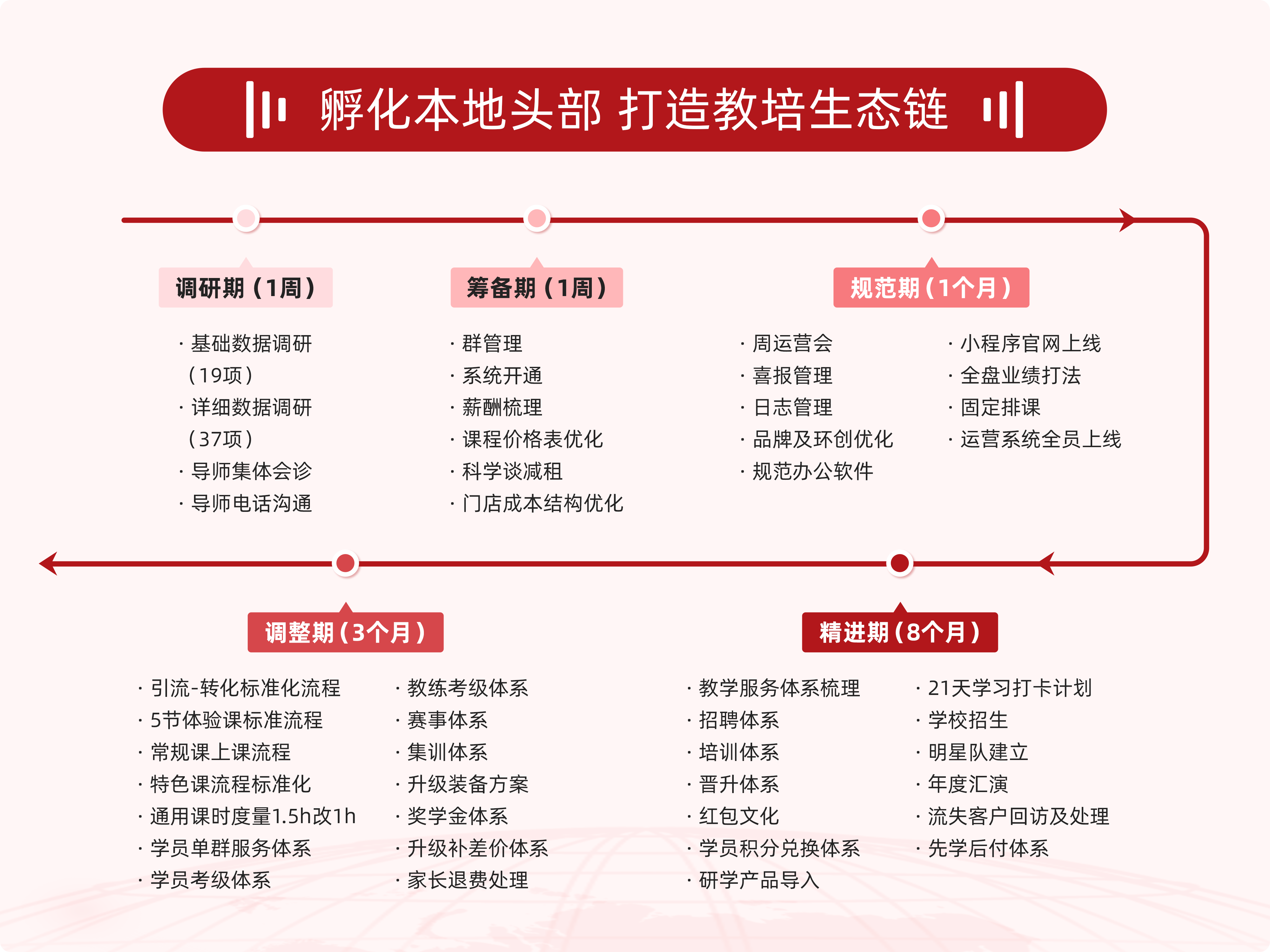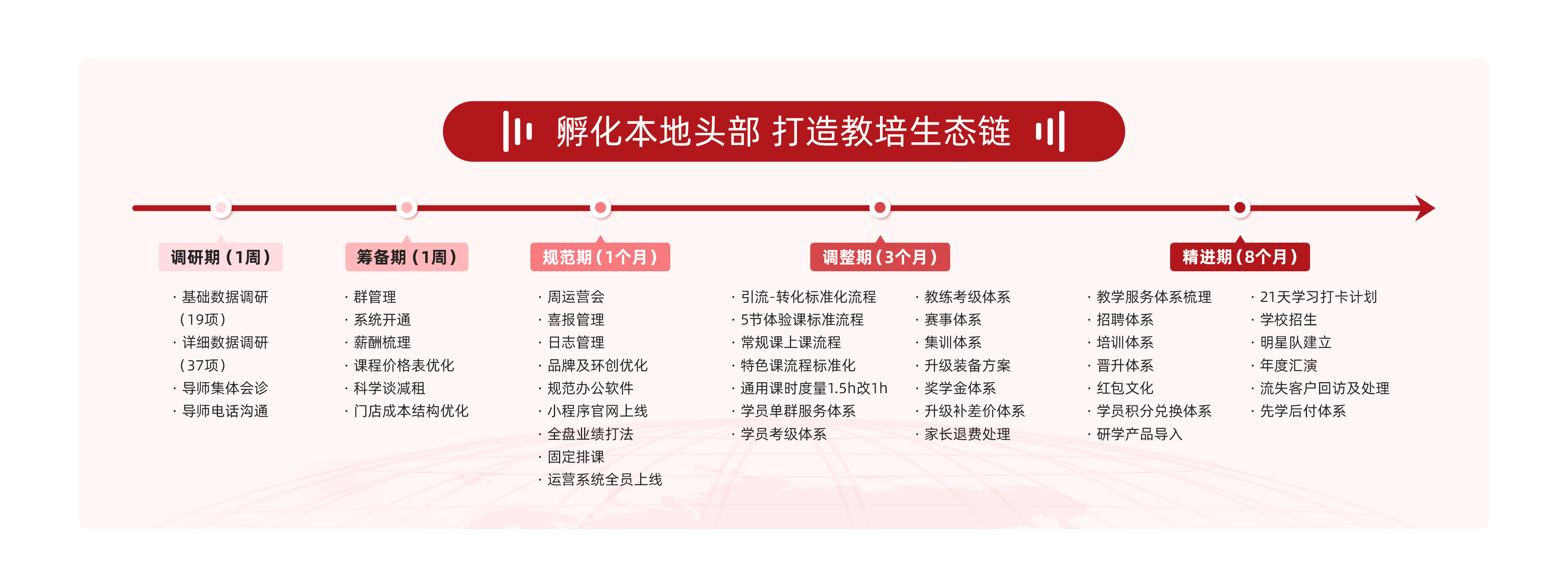 十大服务内容:专属导师每周赋能会议、专属督导追踪执行进度、96项经营数据动态优化、机构人员组织架构优化、岗位薪资绩效方案优化、课程定价体系梳理、专属商业模式设计、全年营销活动策划、多场大咖交流学习、全国优秀同行联动PK。