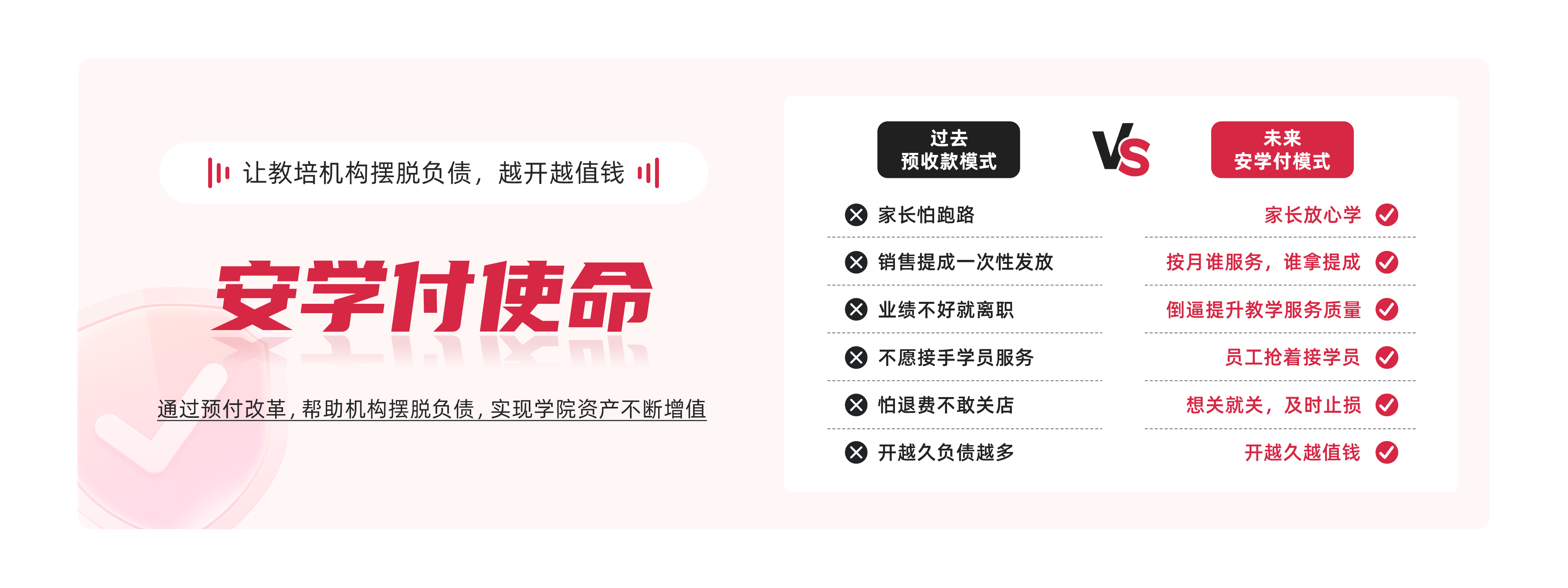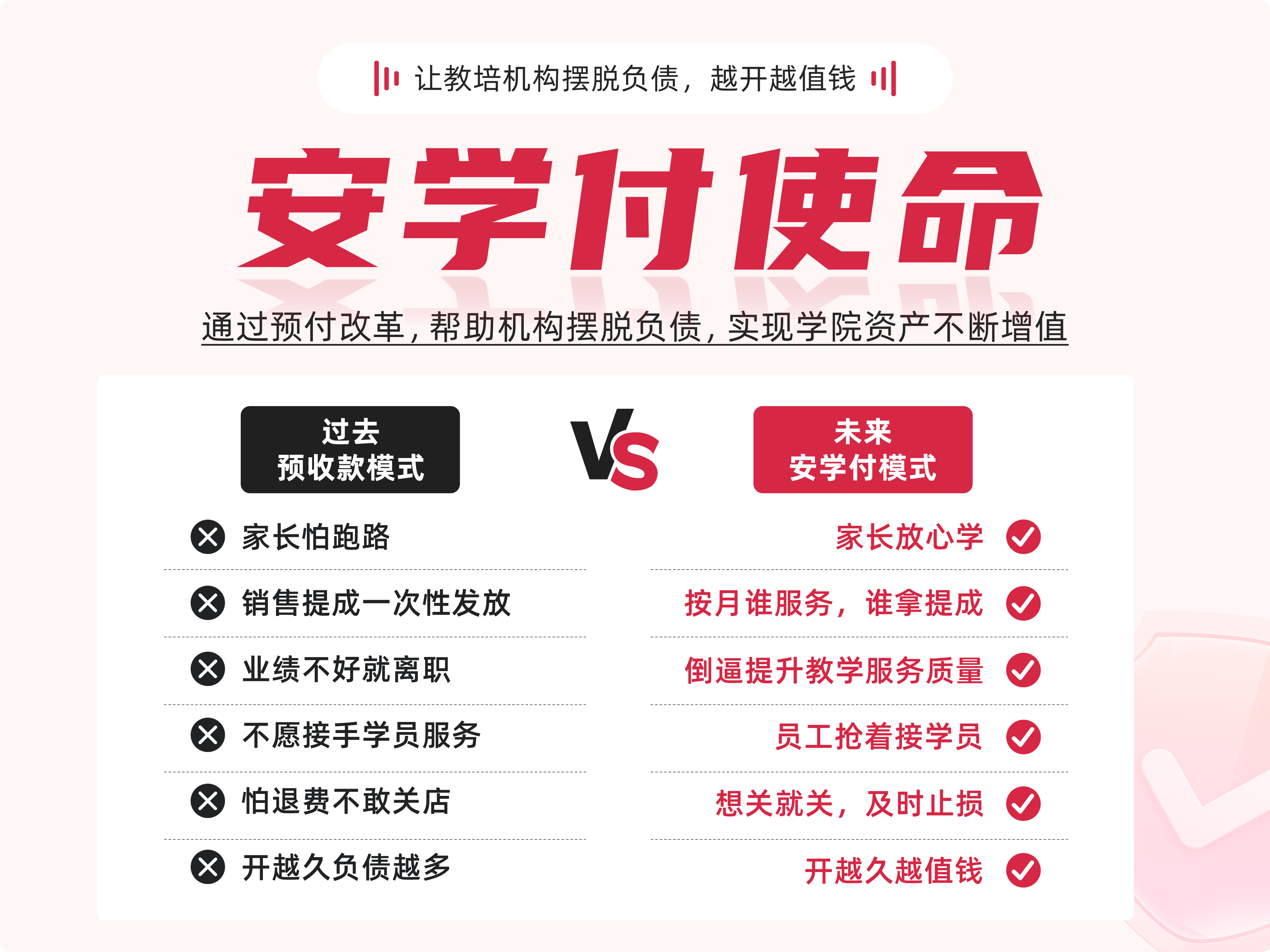 过去教培机构依赖预收款,虽手握现金流,却背负高额课时负债,经营风险重重。 校连壹作为支付宝认证服务商,凭借技术实力,基于支付宝平台进行延伸技术开发,打造专属教培机构的支付方案,并正式命名为“安学付”,全力助推教培行业预付改革。