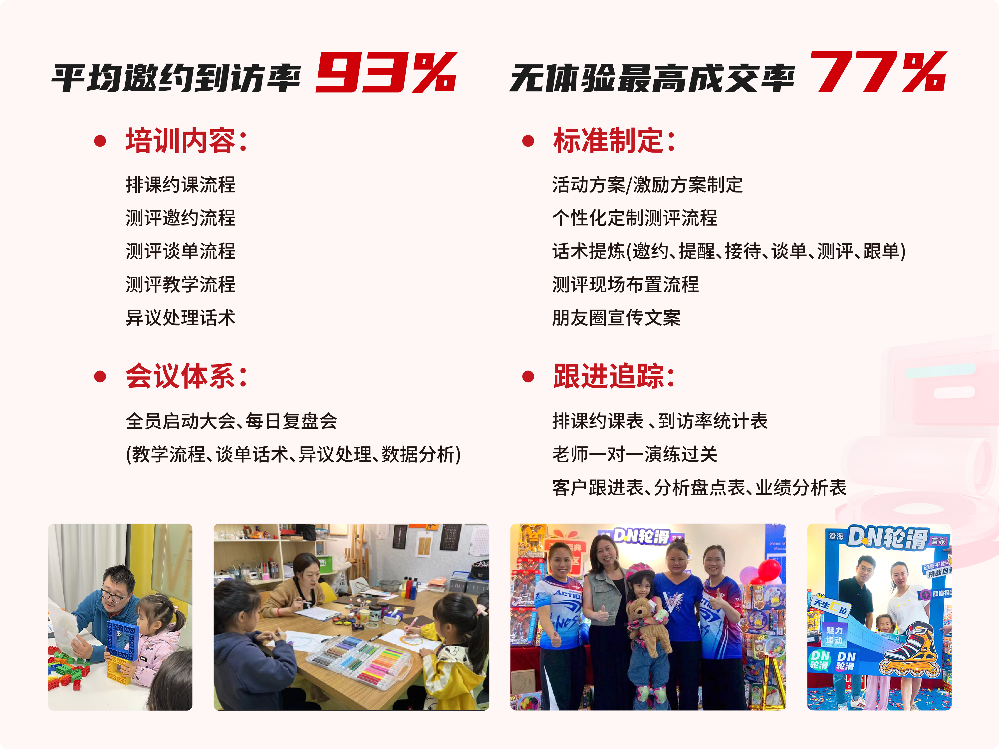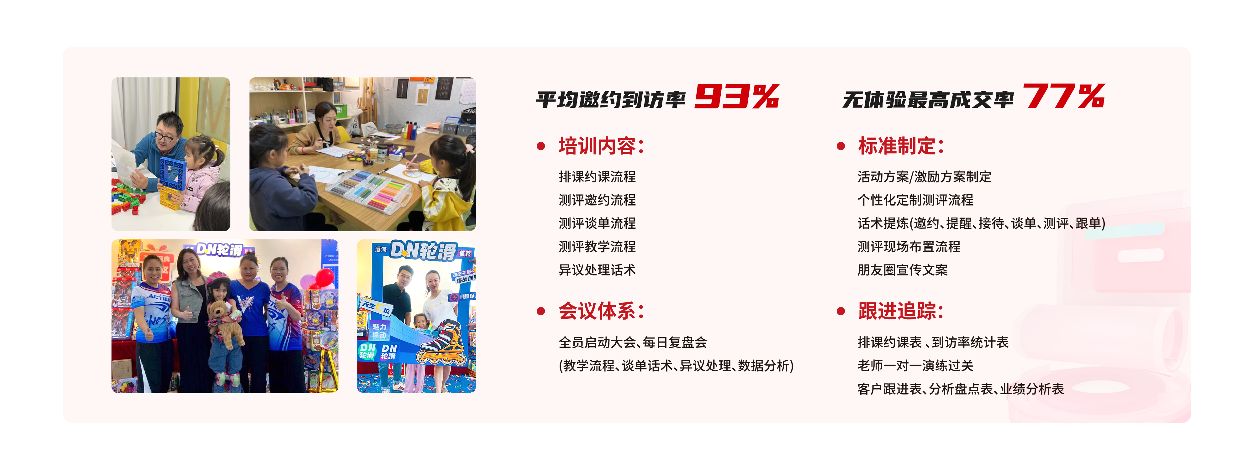 培训内容:排课约课流程、测评邀约流程、测评谈单流程、测评教学流程、异议处理话术;