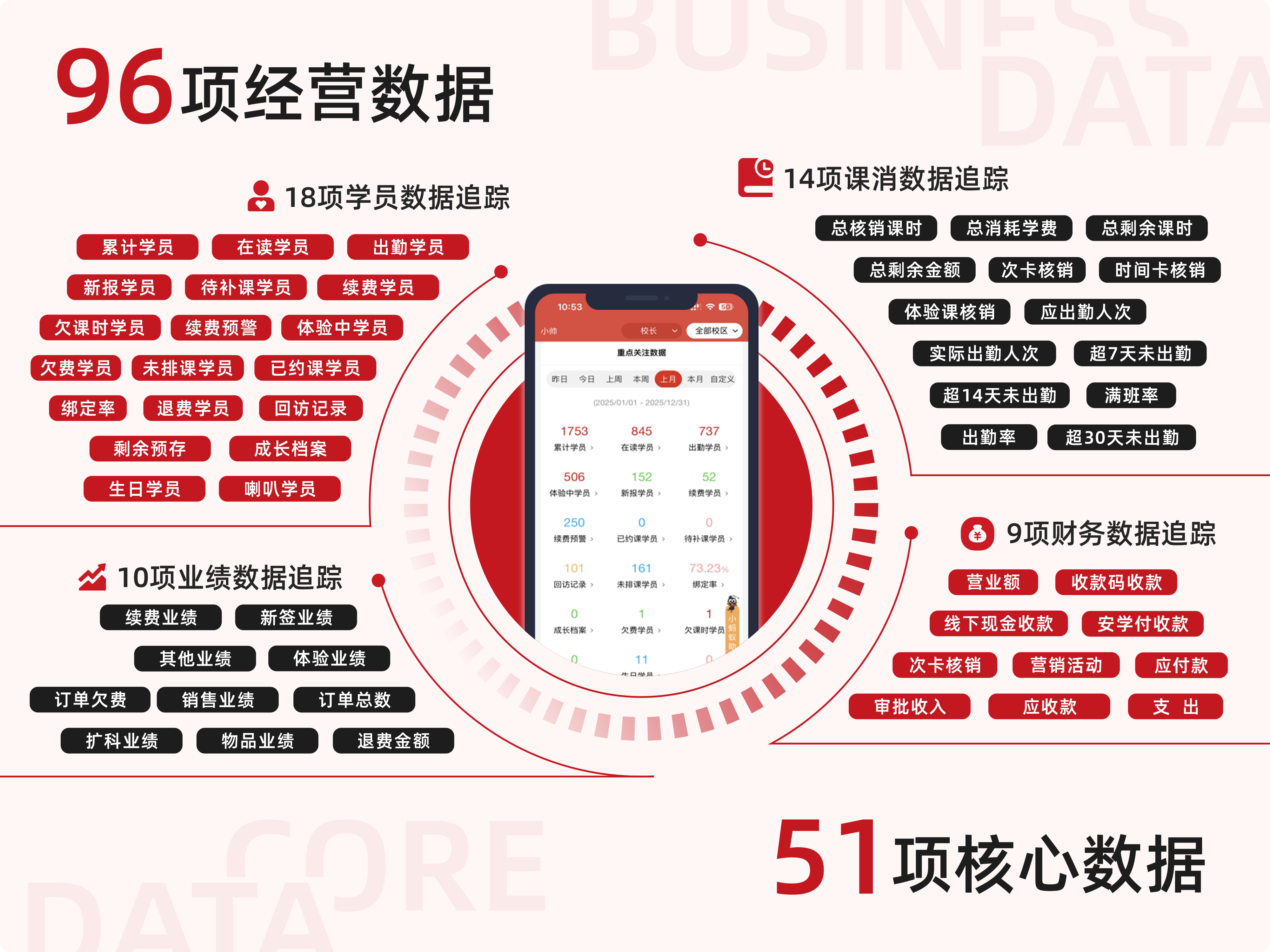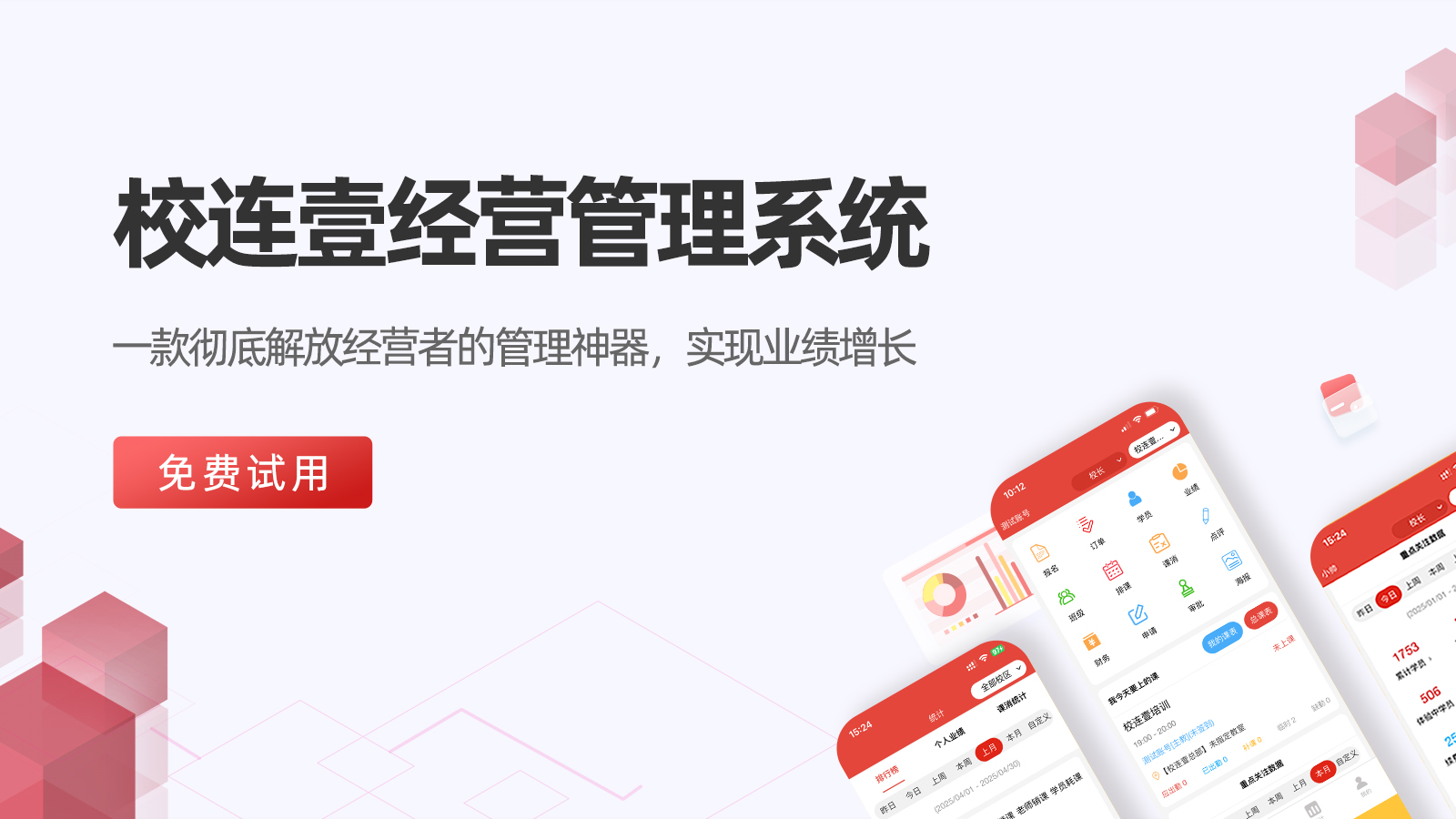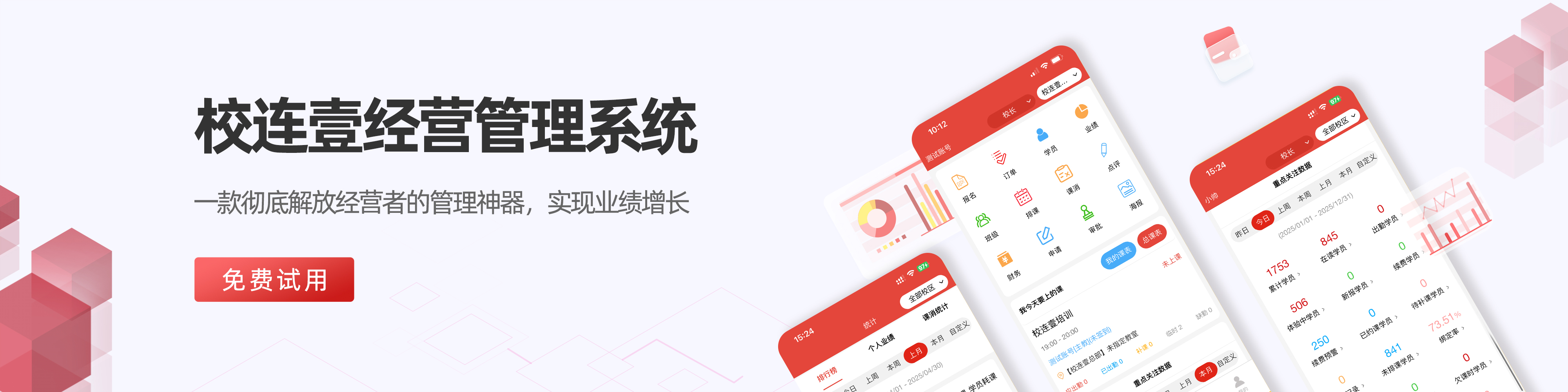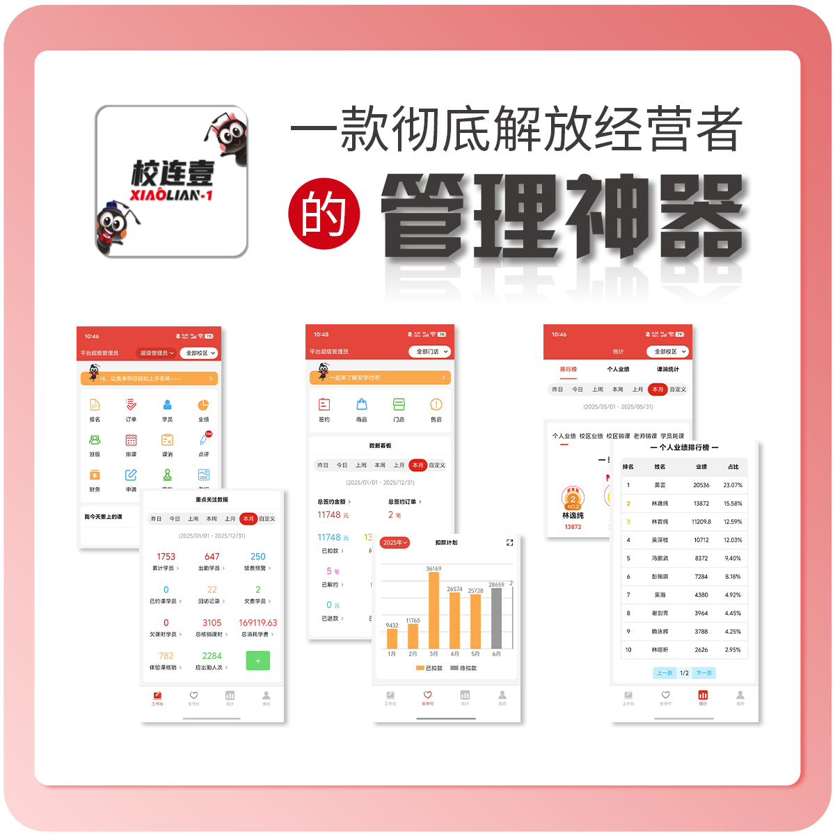 校连壹系统为机构提供功能包含营销招生、运营管理、教务管理、绩效管理、进销存、财务管理,通过科技赋能,实现机构防作弊、降成本、标准化、数据化运营。